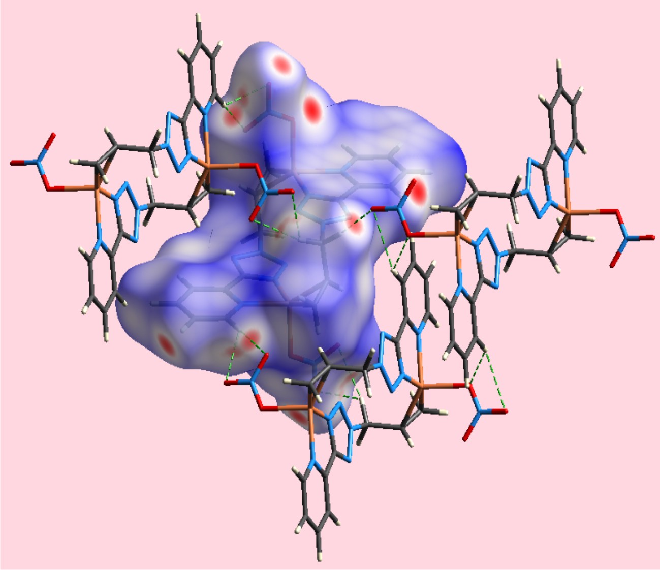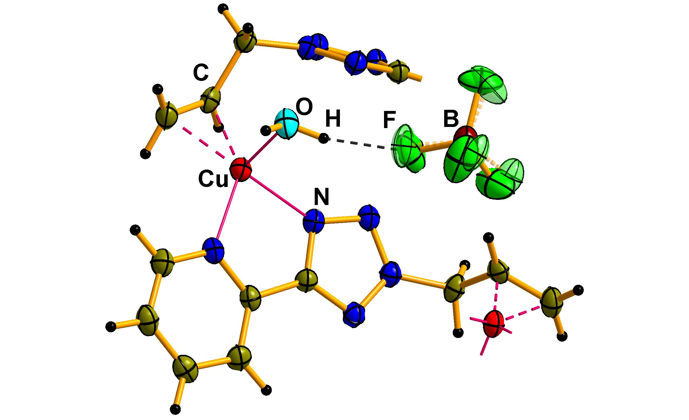 By means of the alternating current electrochemical technique two new [Cu(2-Apyt)NO3] (1) and [Cu(2-Apyt)(H2O)](BF4) (2) π-compounds have been obtained starting from the mixture of 1-allyl-5-(2-pyridyl)-2H-tetrazole (1-Apyt) and 2-allyl-5-(2-pyridyl)-2H-tetrazole (2-Apyt) and corresponding copper(II) salts, and structurally studied. Selective towards 2-allyl- isomer complexation results in a formation of 2-Apyt complexes. Copper(I) ion in both 1 and 2 complexes is coordinated by allylic C=C bond, one pyridyl and one tetrazole N atoms. In both structures Cu+ center adopts distorted tetrahedral surrounding, being additionally coordinated by oxygen of NO3- in 1 and H2O moiety in 2. Coordination of bridging nitrate anion causes the dimeric [Cu(2-Apyt)NO3]2 fragment formation, while participation of H2O in metal coordination leads to infinite {[Cu(2-Apyt)(H2O)]2+}n chain construction. To analyze interactions between the particles in 1 and 2 Hirshfeld surface analysis was performed.