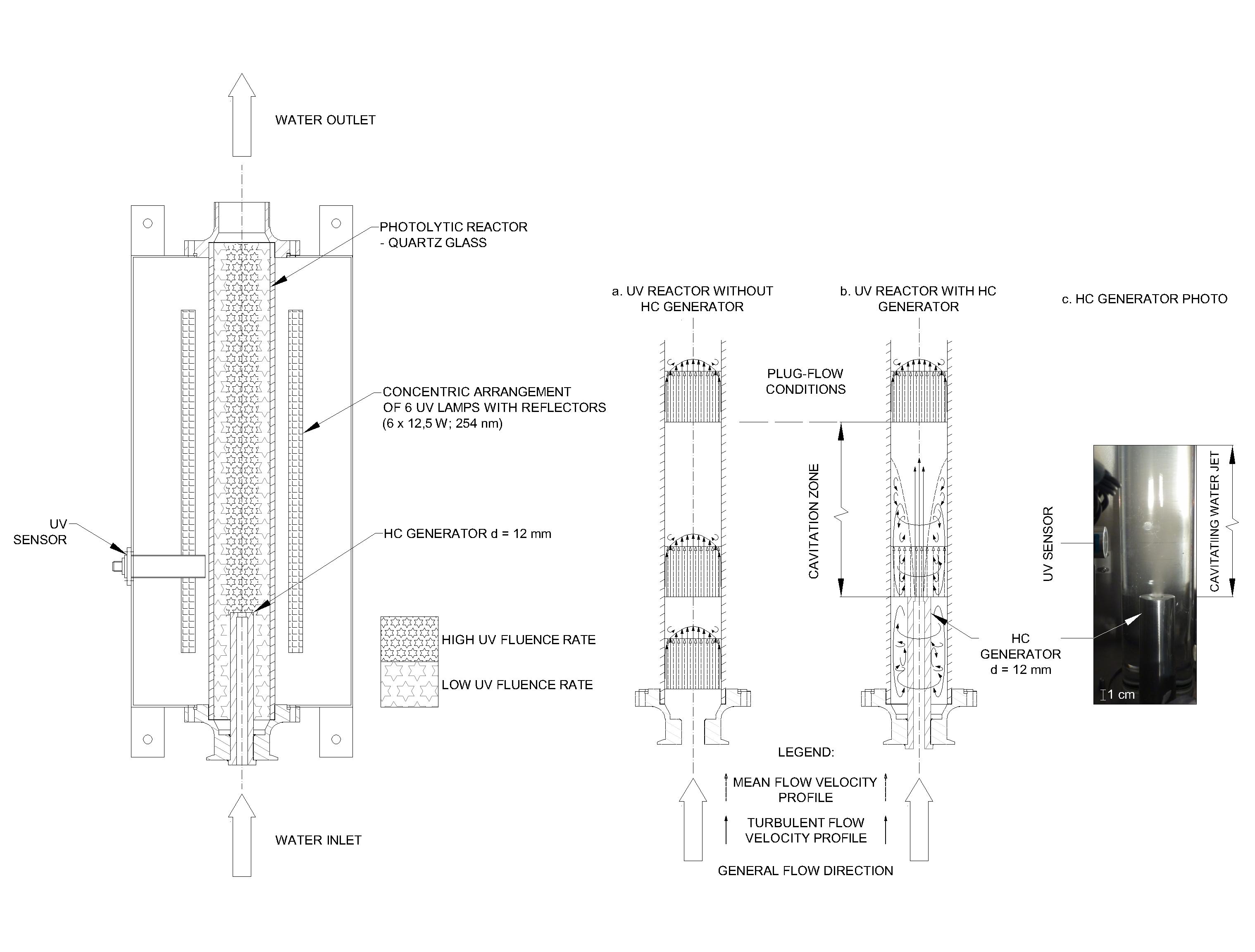 Drinking water contains organic matter that occasionally needs to be treated to assure its sufficient quality and safety for the consumers. H2O2 and UV advanced oxidation processes (H2O2/UV AOPs) were combined with hydrodynamic cavitation (HC) to assess the effects on the removal of selected organic pollutants. Water samples containing humic acid, methylene blue dye and micropollutants (metaldehyde, diatrizoic acid, iohexol) were treated first by H2O2 (dosages from 1 to 12 mg L-1) and UV (dosages from 300 to 2800 mJ cm-2) AOPs alone and later in combination with HC, generated by nozzles and orifice plates (4, 8, 18 orifices). Using HC, the removal of humic acid was enhanced by 5-15 %, methylene blue by 5-20 % and metaldehyde by approx. 10 %. Under favouring conditions, i.e. high UV absorbance of the matrix (more than 0.050 cm-1 at a wavelength of 254 nm) and a high pollutant to oxidants ratio, HC was found to improve the hydrodynamic conditions in the photolytic reactor, to improve the subjection of the H2O2 to the UV fluence rate distribution and to enhance the removal of the tested organic pollutants, thus showing promising potential of further research in this field.