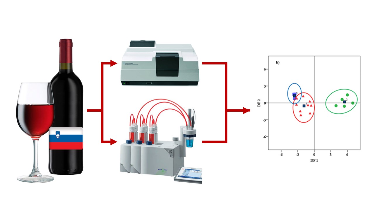 Total phenolic (TPC), flavonoid (TFC) and tannin (TTC) contents, total SO2, total acids, pH, and reducing sugars were measured in twenty five Slovenian red wines from three key wine producing regions, Podravje, Posavje and Primorska. The results were chemometrically analysed and the wines were classified according to wine growing region and vine variety. Principal component analysis proved that TPC, TFC and TTC contents were primarily responsible for variation in the wines. Additionally, linear discriminant analysis (LDA) was performed and resulted in the satisfactory classification of samples by both vine variety and region.