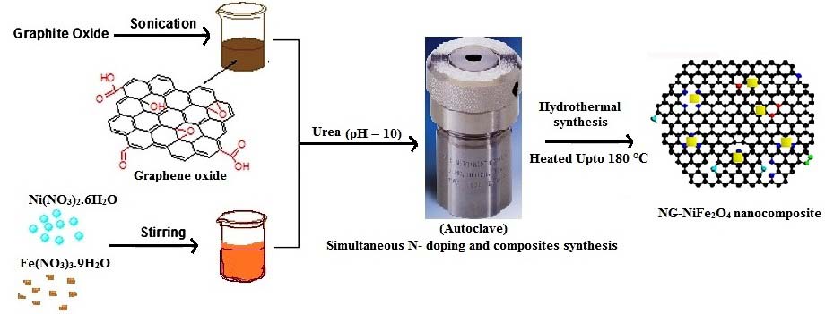 A facile approach has been devised for the preparation of magnetic NiFe2O4 photocatalyst (NiFe2O4-NG) supported on nitrogen doped graphene (NG). The NiFe2O4-NG composite was synthesized by one step hydrothermal method. The nanocomposite catalyst was characterized by Powder X-ray diffraction (PXRD), Scanning electron microscopy (SEM), Transmission electron microscopy (TEM), Fourier transform infrared spectroscopy (FTIR), Ultraviolet–visible spectroscopy (UV-Vis) and Vibrating sample magnetometry (VSM). It is found that the combination of NiFe2O4 nanoparticles with nitrogen-doped graphene sheets converts NiFe2O4 into a good catalyst for methylene blue (MB) dye degradation by irradiation of visible light. The catalytic activity under visible light irradiation is assigned to extensive movement of photogenerated electron from NiFe2O4 to the conduction band of the reduced NG, effectively blocking direct recombination of electrons and holes. The NiFe2O4 nanoparticles alone have efficient magnetic property, so can be used for magnetic separation in the solution without additional magnetic support.