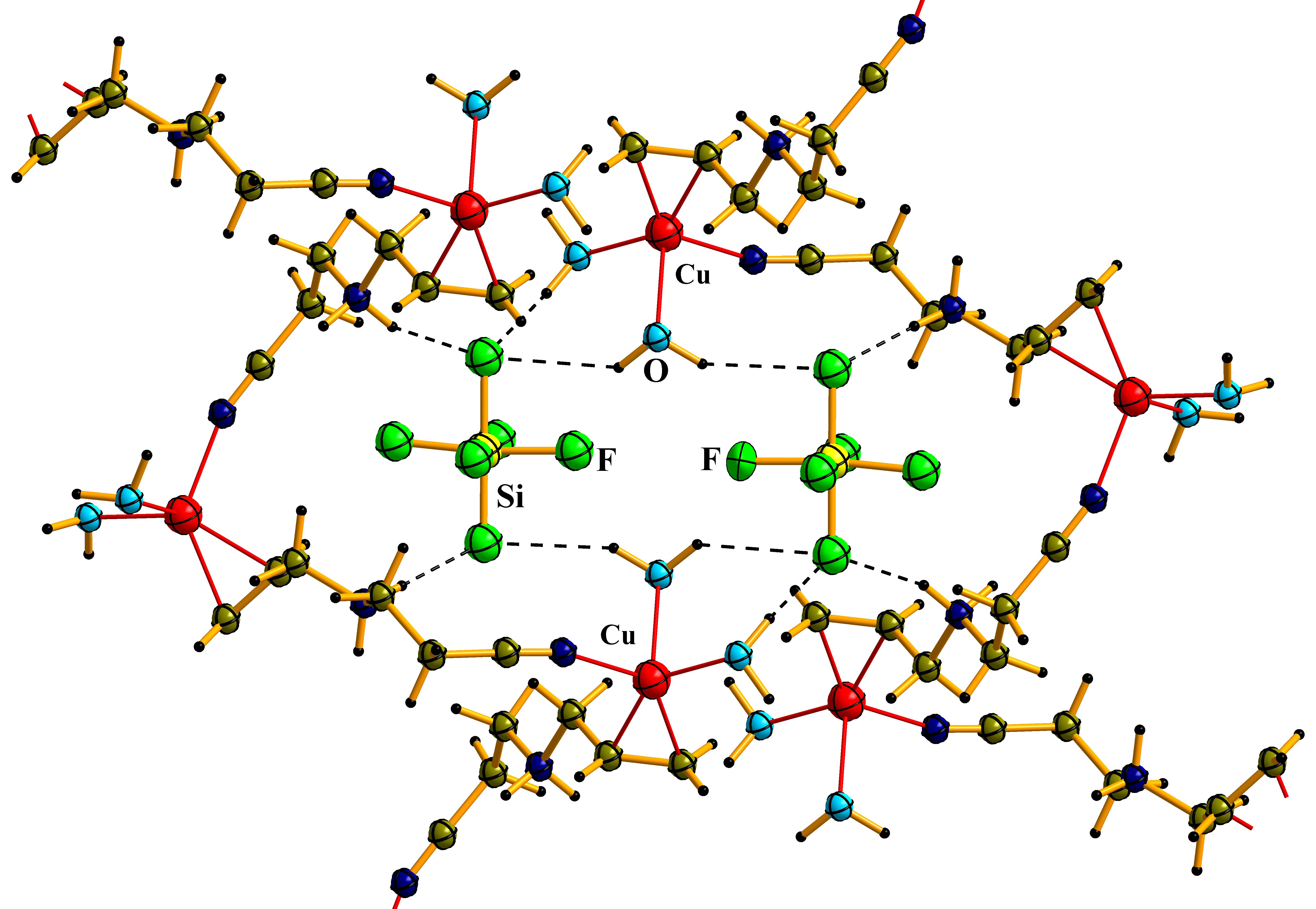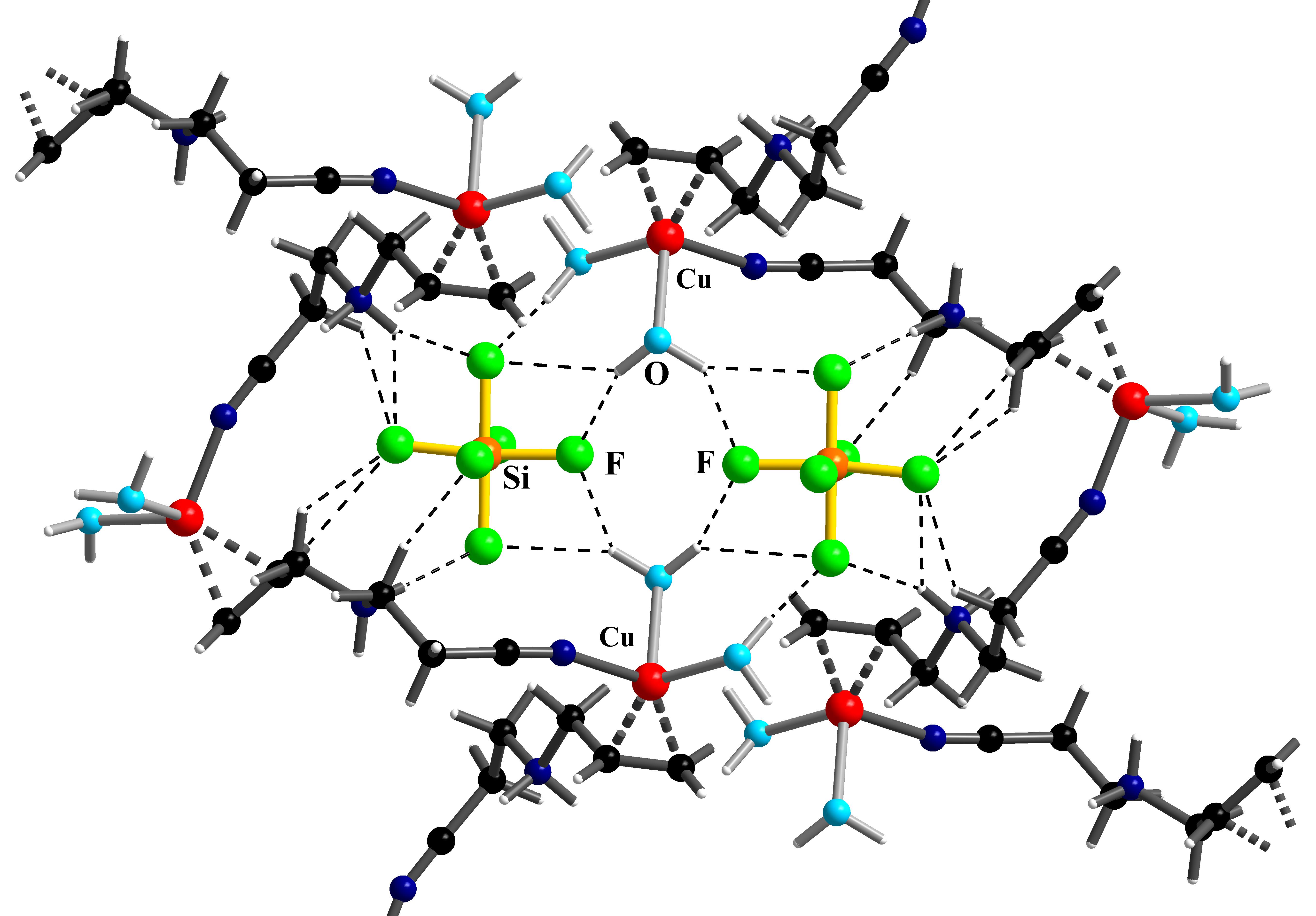 Four copper(I) π-complexes: [Cu(Hapn)NO3]NO3 (1), [Cu(Hapn)(H2O)2]SiF6 (2), [Cu(Hapn)(H2O)BF4]BF4·H2O (3) and [Cu(Hapn)(NH2SO3)2] (4) were prepared using alternating-current electrochemical technique, starting from alcohol solutions of 3-(prop-2-en-1-ylamino)propanenitrile (apn) titrated with appropriate acid and copper(II) salts (Cu(NO3)2∙3H2O, CuSiF6∙4H2O, Cu(BF4)2∙6H2O or Cu(NH2SO3)2∙xH2O, respectively). Obtained compounds were characterized by single-crystal X-ray diffraction and partially by IR spectroscopy. In the structures of complexes 1, 2 and 4 Cu(I) cation possesses a tetrahedral environment formed by the C=C bond of one organic cation Hapn, the N atom of ciano group from another Hapnmoiety, and two O atoms (from NO3– anions in 1, from H2O molecules in 2) or N atoms (NH2SO3– anions in 4). In compound 3 strongly pronounced trigonal-pyramidal coordination environment of Cu(I) is formed by a mid-point of C=C-bond of one Hapncation, nitrogen atom (of cyano group) of another Hapn unit, O atom of H2O molecule in the basal plane, and F atom of BF4– anion at the apical position.