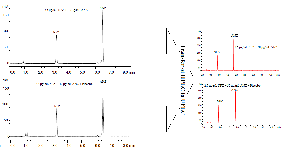 In the present study, simultaneous determination of antazoline hydrochloride (ANZ) and naphazoline hydrochloride (NFZ) in ophthalmic formulations by newly developed ultra-fast liquid chromatographic (UFLC) method was optimized. UFLC separation was performed with ACE Excel 2 C18-PFP column (2 μm, 2.1 x 100 mm) with 0.6 mL/min flow rate of mobile phase which consisted of acetonitrile/phosphate buffer in the ratio of 60:40 (v/v) at 40 ˚C and pH adjusted to 3.0 with 0.5 % v/v triethylamine. The detection of ANZ and NFZ was performed at a wavelength of 285 nm and injection of samples was 1.0 µL. The runtime for analysis was 4.5 min and retention times of NFZ and ANZ were found to be 0.92 and 1.86 min, respectively. The calibration graph was linear for ANZ and NFZ with r2 greater than 0.998 while repeatability and reproducibility (expressed as RSD %) were lower than 1.28 % and 2.14 % respectively. Comparison of UFLC was done with HPLC, UFLC method had remarked advantages over HPLC as run time reduced by 3.4 fold and solvent consumption decreased 5 times. Moreover, detection limits determined by UFLC were 1.5 fold less than HPLC. Force degradation indicated the complete separation of analytes in the presence of degradation products provided the justification of method specificity. The proposed UFLC method was demonstrated to be simple and rapid for the determination of ANZ and NFZ in ophthalmic solutions providing recoveries in the range between 99.6 and 100.4 %.
