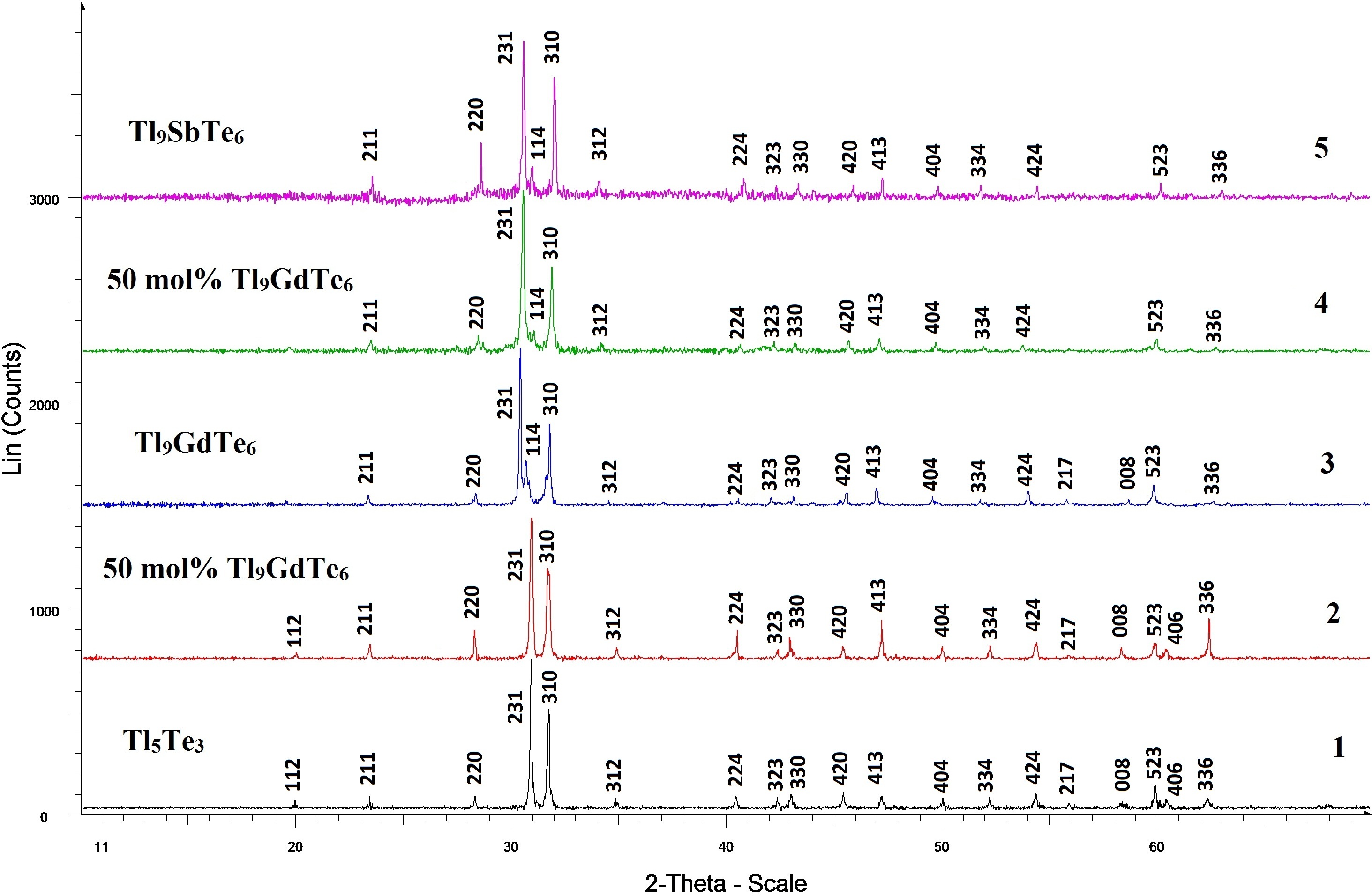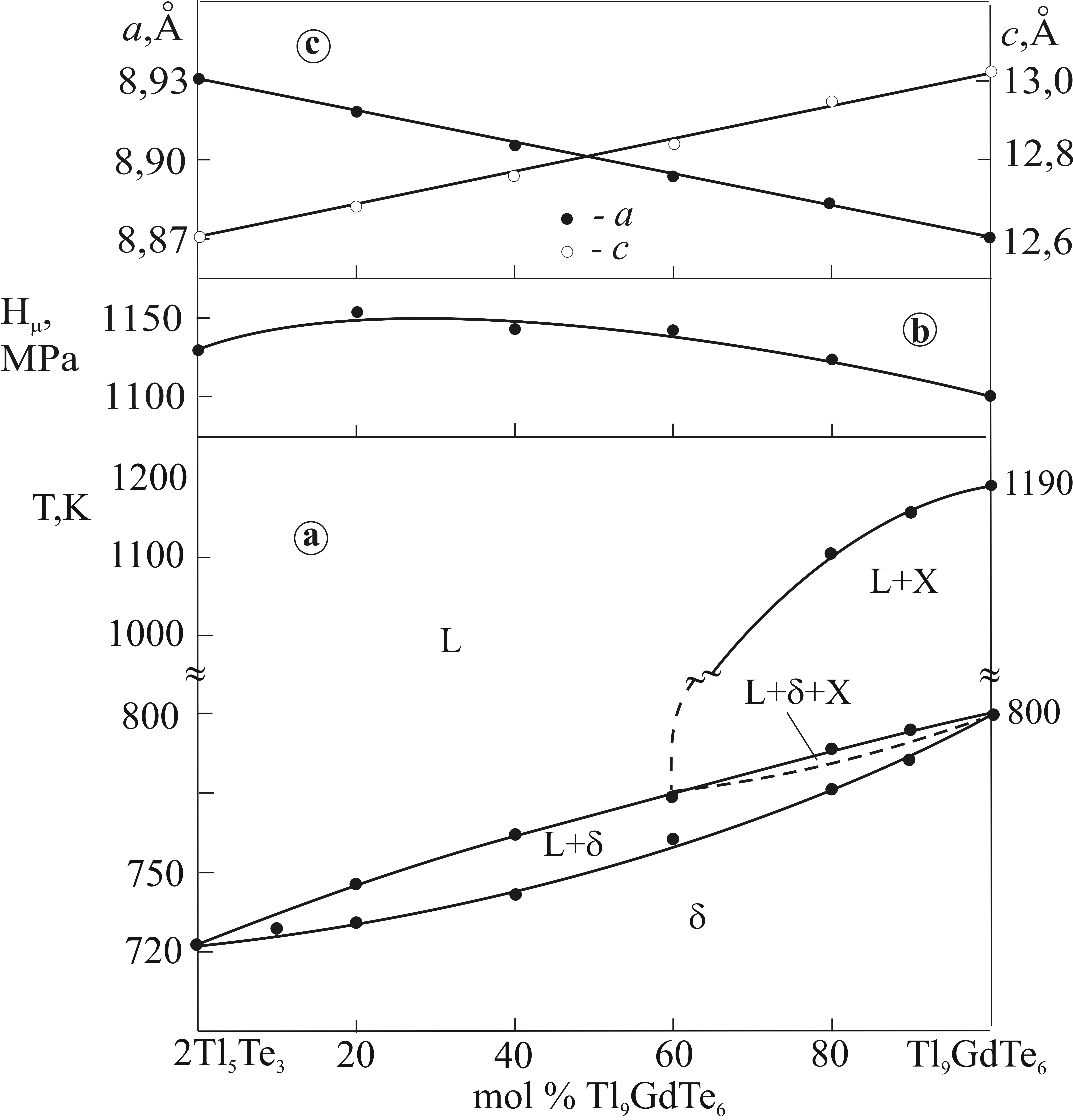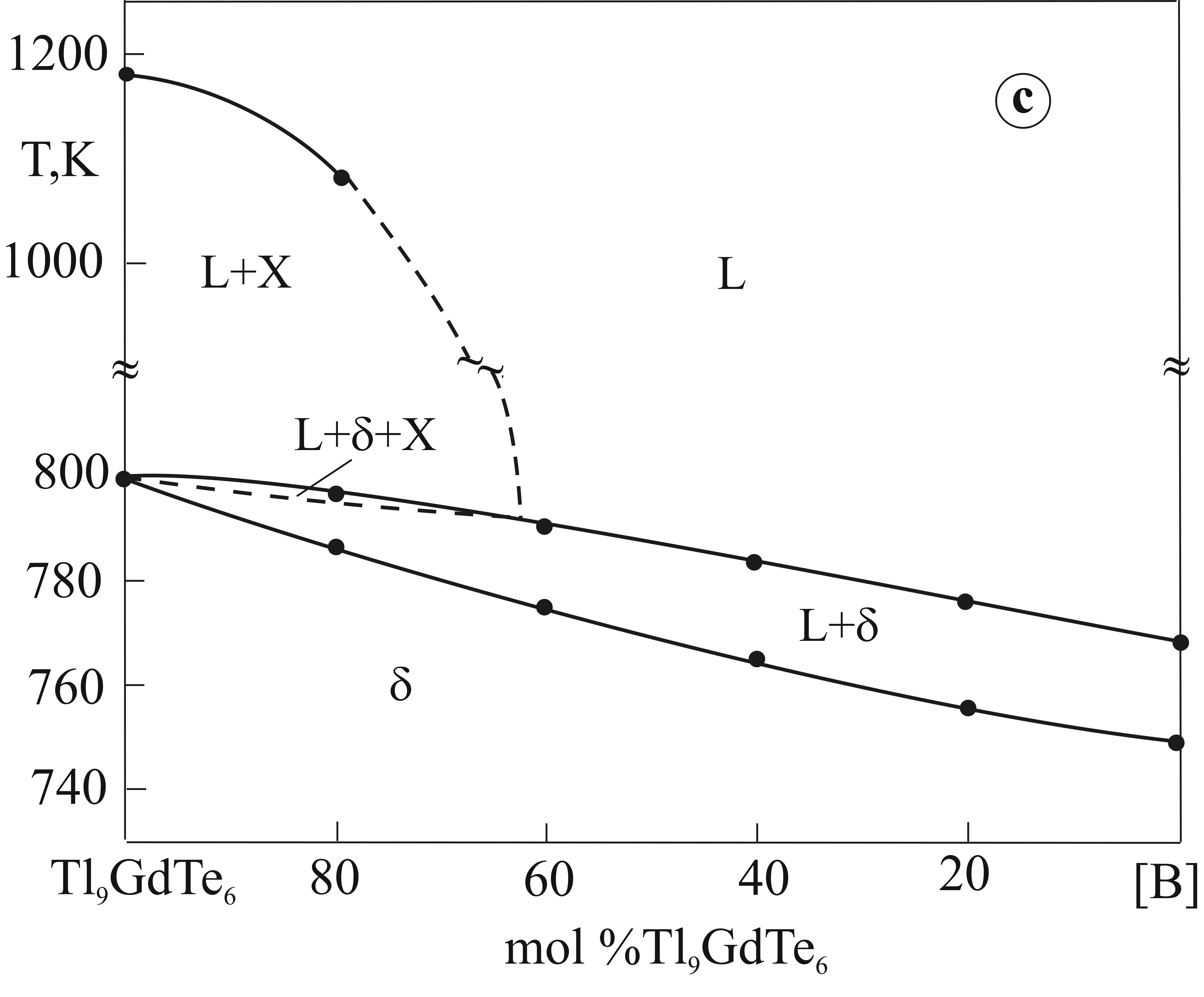 thallium-antimony tellurides, thallium-gadolinium tellurides, phase equilibria, projections of the liquidus and solidus, solid solutions, crystal structure.Abstract