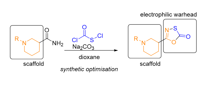 Using rescaffolding approach, we designed piperidine compounds decorated with an electrophilic oxathiazol-2-one moiety that is known to confer selectivity towards threonine proteases. Our efforts to prepare products according to the published procedures were not successful. Furthermore we identified major side products containing nitrile functional group, resulting from carboxamide dehydration. We systematically optimized reaction conditions towards our desired products to identify heating of carboxamides with chlorocarbonylsulfenyl chloride and sodium carbonate as base in dioxane at 100 °C. Our efforts culminated in the preparation of a small series of piperidin-3-yl-oxathiazol-2-ones that are suitable for further biological evaluation.