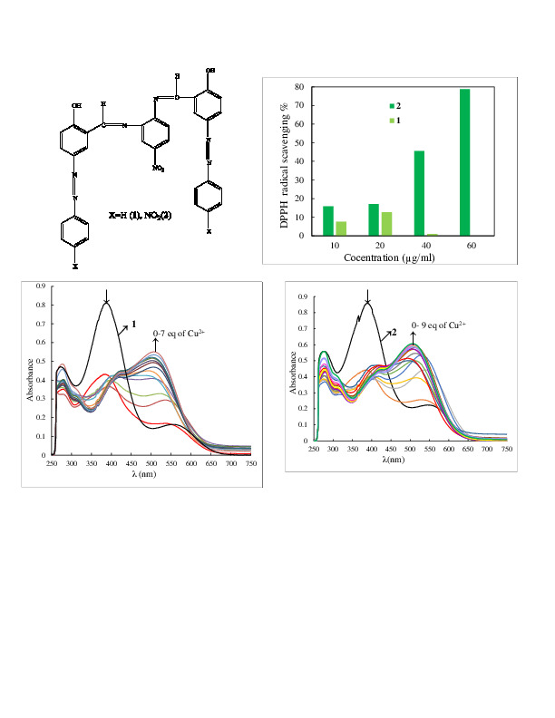 According to applicability of azo-azomethine compounds in chemical sensors and biological activities, two receptors: 1,2-[1-(3-imino-4-hydroxophenylazobenzene)]-4-nitrobenzene (1) and 1,2-[1-(3-imino-4-hydroxophenylazo-4-nitrobenzene)]-4-nitrobenzene (2) are investigated for detection of nickel, cobalt, copper, lead, mercury, zinc and cadmium divalent metal ions by UV-vis spectroscopy. With the addition of all metal ions to the DMSO solution of ligands, the peaks at 558 and 549 nm increase in intensity with hypsochromic or bathochromic shifts except Zn2+ ions and 2, while the peaks at 388 and 391 nm dramatically decrease in intensity. In both cases, the largest shift is observed after addition of copper ions. In solution, both receptors produce a cation blue shift from 558 and 549 nm to 503 and 497 nm with the sensible color change of solutions from purple-red to orange. Therefore, both compounds can highly recognize copper ions in DMSO solution. In the next step, Benesi-Hildebrand plot and Job's method are used for determination of binding constant (Ka) and stoichiometry of formed complexes, respectively. Also, the investigation of solvent effect in the UV-vis spectra of ligands shows that the generation of hydrazine and enaminone tautomers increases in highly polar solvents such as DMF and DMSO. Finally, the antioxidant activity of ligands is studied by DPPH method. The results show that NO2 withdrawing groups in 1,2-[1-(3-imino-4-hydroxophenylazo-4-nitrobenzene)]-4-nitrobenzene probably affect keto−enol equilibrium. As a result, this ligand reduces free radicals to non-reactive species by donating hydrogen.