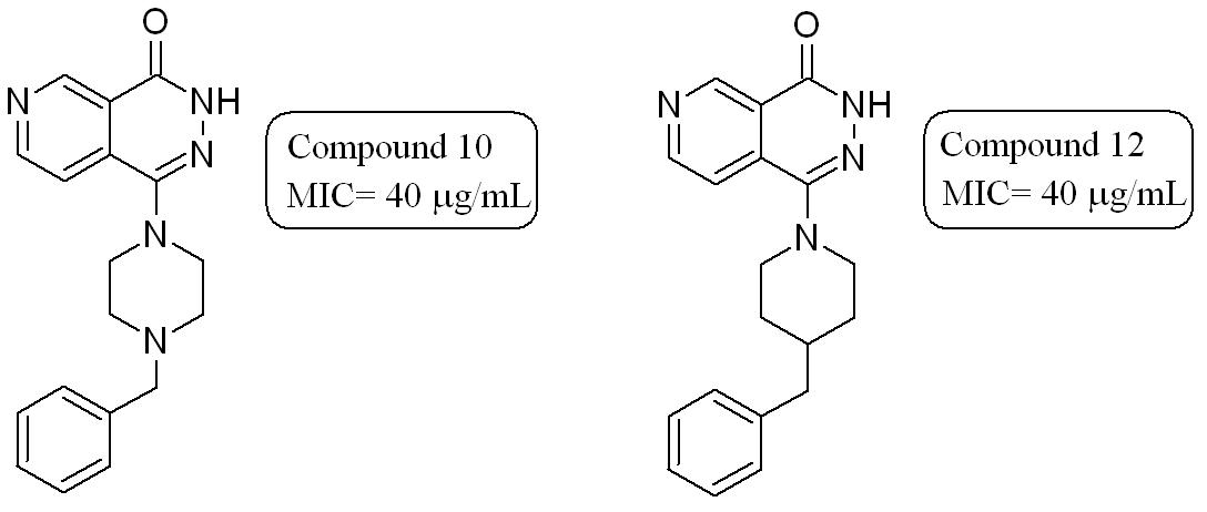 In this study, new pyrido[3,4-d]pyridazine derivatives were synthesized and evaluated for their in vitro antibacterial, antifungal and antimycobacterial activities. Among the synthesized compounds, compound 10 (1-(4-benzylpiperazin-1-yl)pyrido[3,4-d]pyridazin-4(3H)-one) and compound 12 (1-(4-benzylpiperidin-1-yl)pyrido[3,4-d]pyridazin-4(3H)-one) were found to have the highest antimycobacterial activity. However, all compounds were found ineffective against tested Gram-positive, Gram-negative bacteria and fungus.