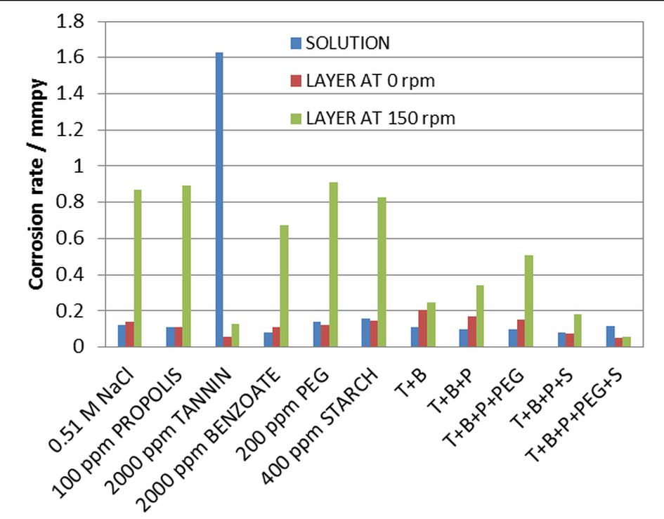 The ubiquitous use of plain and low-alloy steels in neutral, chloride bearing environments presents an everyday challenge for corrosion protection professionals. This paper explores the possibility of developing a non-toxic and environmentally friendly synergistic inhibitor mixture made of propolis, tannin, sodium benzoate, PEG400 and starch that could be applied into the solution to induce the formation of a persistent protective layer on steel. Components of the mixture were chosen based on the references giving their characteristics relevant to their possible action in the solution and/or at the surface of the steel. The efficiency of the protective layer formed under the influence of the inhibitor mixture, and then measured by the LPR probe in the inhibitor-free solution, was the lowest under quiescent conditions (75%) and the highest (95%) under flow conditions. Both, LPR and EIS data indicate that the inhibitor modified layer presents a barrier for diffusion of oxygen that acts as a primary corrosion reaction depolarizer in the investigated neutral chloride solution. The demonstrated persistence of the inhibitor modified layer is of primary interest as it gives possibility batch application.