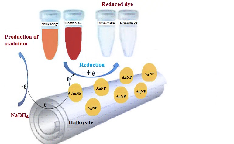 Halloysite nanotube supported Ag nanoparticles (Ag/HNT) as catalyst for reduction of Rhodamine 6G (Rh6G) and Methyl orange (MO) have been synthesized and tested. 3-glycidyloxyproyltrimethoxysilane and Triethylene tetramine were successfully utilized to modify the HNTs surface, then Ag+ ions were reduced to AgNPs on this functionalized HNT surface. The structure of AgNPs-impregnated HNT wall was characterized by FTIR, XRD, TEM, FE-SEM and EDX showing the AgNPs to be 10-15 nm in size. The catalytic activity of Ag/HNTs for Rh6G and MO reduction was investigated by UV-vis spectroscopy so as catalyzed and uncatalyzed reaction rate constants could be compared. The rate constant (k) of Rh6G and MO reduction was calculated for catalyzed reactions as 0.224 min-1and 0.222 min-1, and for un-catalyzed reactions as 0.049 min-1 and 0.014 min-1, respectively. The Ag/HNT catalyzer was effectively recycled six times without appreciable loss of activity. Results indicate that supporting AgNPs on HNT surface functionalized with other compounds with superior performance in reducing Rh6G and MO dyes exist.