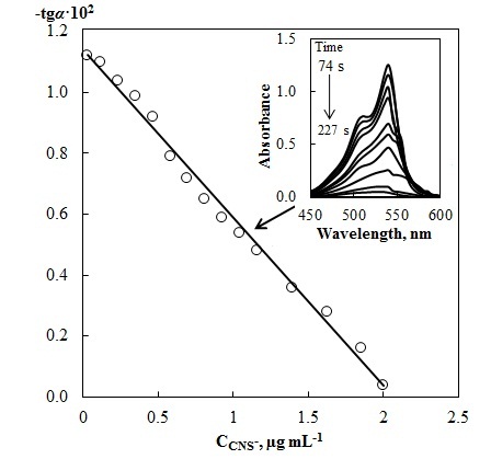 In the present study a kinetic-spectrophotometric method for thiocyanate determination is described. The suggested method for the determination of thiocyanate is based on its “Landolt effect” on the reaction of bromate with hydrobromic acid, which leads to the formation of only one halogen bromine. The reaction was monitored spectrophotometrically at the maximum wavelength of astrafloxine FF light absorption at 535 nm. The absorbance of reactants mixture decreased with an increase of the reaction time. The calibration curve for thiocyanate determination was obtained in the concentration range of 0.03–2.0 μg mL−1 under the optimal conditions (pH 1.5; CBrO3- = 7.6 × 10-4 mol L-1; Castrafloxine FF = 1 × 10-5 mol L-1). The limit of detection was 0.01 μg mL−1. The method was successfully applied to the determination of thiocyanate in human saliva samples with satisfactory results.