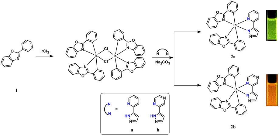 Two new iridium(III) complexes were synthesized and fully characterized, [(bo)2Ir(pzpy)] (2a) and [(bo)2Ir(pzpyz)] (2b) (where bo = 2-phenylbenzo[d]oxazole, pzpy = 2-(1H-pyrazol-3-yl)pyridine, pzpyz = 2-(1H-pyrazol-3-yl)pyrazine). The single crystal structures of 2a-2b have been determined. Considering the relationship between their structures and photophysical properties, DFT calculations have been used to further support this inference. These Ir(III) complexes emit from the excited state of 3MLCT/3LLCT in the green and yellow region, and the quantum yields in the degassed CH2Cl2 solution at room temperature are 35.2% and 46.1%. Theoretical and experimental results show that iridium(III) complexes 2a-2b are promising phosphorescent material.