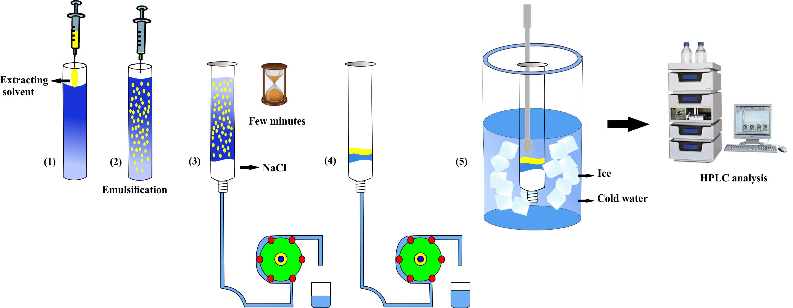 A simple, efficient and quick salting-out based centrifugeless dispersive liquid-liquid microextraction combined with high-performance liquid chromatography-ultraviolet detection (HPLC-UV) has been successfully developed for the determination of selected parabens in environmental water samples. Herein, following the dispersion of the extracting solvent (1-undecanol) whose melting point is near the room temperature into the sample solution, the cloudy mixture is passed through a test tube filled with sodium chloride, acting as separating agent based on salting-out phenomenon. By immersing the tube inside an ice bath, the fine droplets of the extraction solvent are solidified, easily collected and after returning to the liquid state, injected into HPLC-UV. The values of the detection limit were in the range of 2.5-5.0 µg L-1 while the intra-day (n = 7) and inter-day (n = 9, within three days) precision were below 3.7 and 4.7%, respectively. A satisfactory linearity (0.997 ≥ r2 ≥ 0.996) and quite a broad linear range (5.0-250 µg L-1) were achieved. The relative errors as the accuracy were less than 6.4% in all experiments. The method was eventually employed for the preconcentration and determination of the analytes in various natural water samples and acceptable results were achieved.
