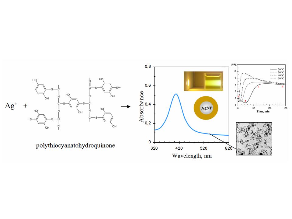 Motivated by evidence that silver nanoparticles have found numerous technological applications we have explored in this work utilization of polythiocyanatohydroquinone as a new efficient reducing and stabilizing agent for the preparation of such nanoparticles. The formation of silver nanoparticles has been confirmed by the UV–Vis spectroscopy, X-ray powder diffraction and by transmission electron microscopy. The potentiometric and spectroscopy kinetic measurements during the nanoparticles growth are also presented. Thermodynamic activation parameters for the silver nanoparticle formation have been determined from the reaction kinetic studies at variable temperatures. On the ground of observations using these techniques, a mechanism for silver nanoparticle growth has been proposed. The narrow size (20–40 nm) and spherical shape distribution of the fabricated nanoparticles together with the high stability of colloids for sedimentation provide a firm basis for applications of the polythiocyanatohydroquinone polymer as a reducing and stabilizing material for the metal nanoparticles preparation and storage.