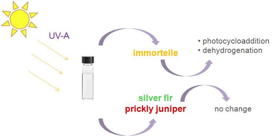 The objective of this study was to evaluate impact of light and available oxygen on the chemical composition of three selected essential oils. Aliquots of immortelle (Helichrysum italicum), silver fir (Abies alba) and prickly juniper (Juniperus oxycedrus) essential oils were exposed to UV-A irradiation in the presence of atmospheric oxygen as well as in the presence of inert gas. The compositions of fresh and irradiated samples were studied by GC/MS. Each oil showed an individual response to the applied conditions. In immortelle oil, dominant process was phototransformation of g-curcumene to italicene, isoitalicene and α-curcumene. Since g-curcumene is one of the major components of immortelle essential oil, exposure of this oil to light can cause significant changes in primary composition and thus quality. In silver fir and prickly juniper oil irradiation caused only slight changes among sesquiterpenes that are present as minor components. Both oils were found to be photostabile and insensitive to the presence of atmospheric oxygen.