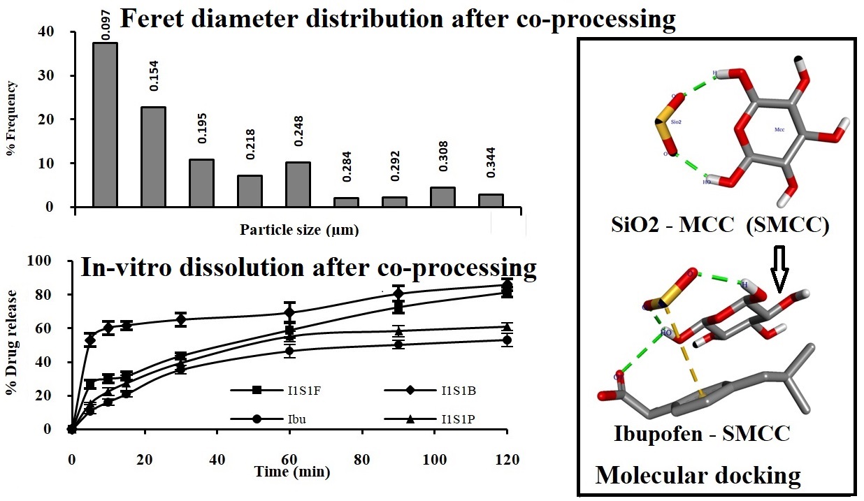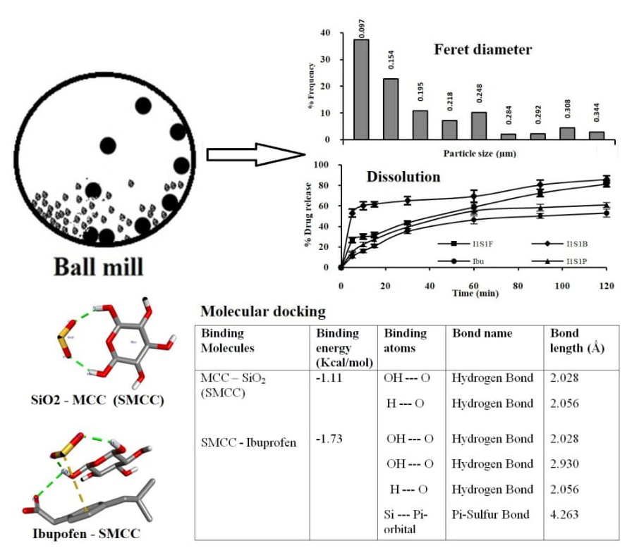 Analysis of the binding interactions of ibuprofen and silicified-microcrystalline cellulose (SMCC) has been undertaken. Co-processing of ibuprofen with SMCC was carried out by solid state ball milling, and aqueous state equilibration followed by freeze drying to investigate the effect of silicified-microcrystalline cellulose on ligand. Molecular docking study revealed that ibuprofen formed complex through hydrogen bond with microcrystalline cellulose (MCC) and silicon dioxide (SiO2); the binding energy between MCC and SiO2, and ibuprofen and SMCC were found as -1.11 and -1.73 kcal/mol respectively. The hydrogen bond lengths were varying from 2.028 to 2.056 Å. Interaction of Si atom of SMCC molecule with Pi-Orbital of ibuprofen has shown the bond length of 4.263 Å. Significant improvement in dissolution of ibuprofen has been observed as a result of interaction. Binary and ternary interactions revealed more stabilizing interactions with ibuprofen and SMCC compared to SMCC formation.