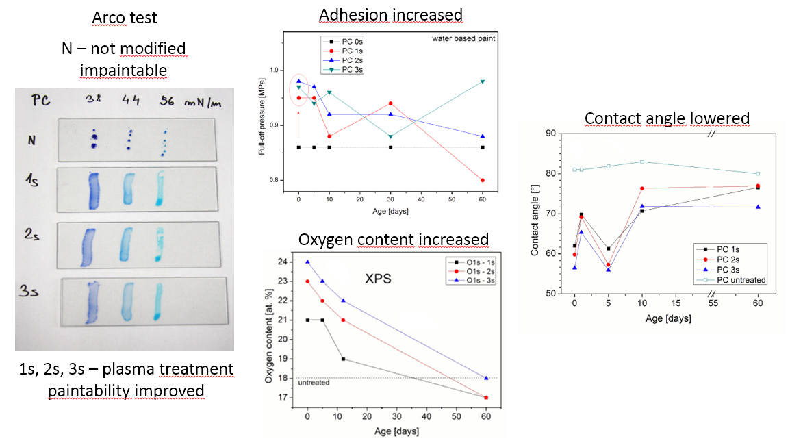The, polyethylene (PE), polypropylene (PP) and polycarbonate (PC) flat substrates were treated by the DBD plasma in air for 1 s, 2 s and 3 s. The adhesion of two types of paints (water based and solvent based) was studied by the pull-off test. The other methods were utilized to gain the information about the surface of the samples. The measurement of contact angle of water and Arcotest (commercial test using set of fluids with defined surface tension) and the XPS technique were used to obtain the chemical composition of the sample surface. The pull-off test confirmed increased adhesion of both types of paints, which is related to oxygen content confirmed by XPS. The aged (60 days) samples keep their enhanced properties although some return to initial state was observed.
