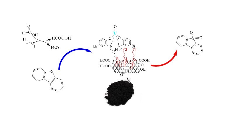 New heterogeneous catalyst was synthesized via covalent anchoring of oxovanadium(IV) complex of 5,5′-dibromobis(salicyledene)diethylenetriamine (VO[5-Br(Saldien)]) on the surface of chloro-modified graphene oxide (GO@CTS). The structure of the catalyst was investigated using different characterization techniques such as XRD, SEM, EDX, FT-IR, TG, DTA and ICP-AES analyses. The synthesized heterogeneous oxovanadium(IV) was an efficient catalyst for high yield and selective oxidation desulfurization (ODS) of dibenzothiophene (DBT) as a model oil using H2O2 as oxidant and formic acid as a promoter. The effects of the catalyst mass, reaction temperature and time, formic acid/H2O2 ratio and molar ratio of H2O2 to the total amount of sulfur (O/S) on oxidation desulfurization activity were investigated. Moreover, the prepared catalyst can be easily separated from the reaction mixture and reused six times without a significant loss of catalytic activity and selectivity.