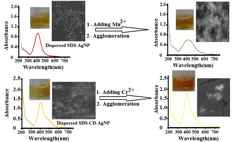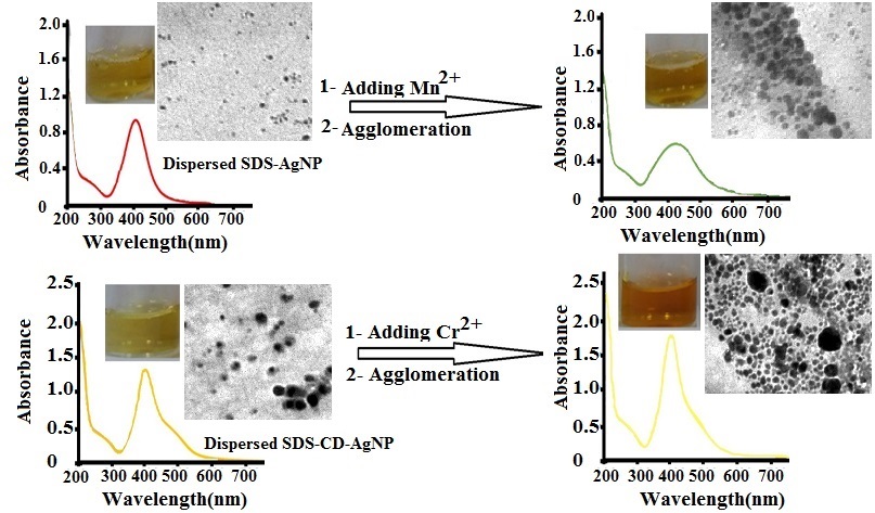 The present study was conducted to determine manganese (Mn2+) and chromium (Cr2+) ions in aqueous systems with a simple, rapid, sensitive, selective, and cost-effective colorimetric approach. Sodium dodecyl sulfonate (SDS) and β-cyclodextrin (CD) were used as both stabilizer and surface functionalizing agents for the synthesis of silver nanoparticles (AgNPs). Synthesized AgNPs were characterized by FT-IR spectroscopy, UV-visible spectroscopy, scanning electron microscopy (SEM), and dynamic light scattering (DLS) techniques. The effect of pH on the stability of nanoparticles was investigated. SDS modified silver nanoparticles (SDS-AgNPs) and SDS with β-cyclodextrin modified silver nanoparticles (SDS-CD-AgNPs) demonstrated sensitive and selective colorimetric detection of Mn2+ and Cr2+ ions at ppm level, respectively. The prepared SDS-AgNPs and SDS-CD-AgNPs solution showed a color change visible to the naked eye from yellow to orange upon adding Mn2+ and Cr2+ ions, respectively; however, other metal ions did not induce such a change. In addition, the results of SEM and DLS for both sensors showed the aggregation of nanoparticles after adding Mn2+ or Cr2+. Overall, the results of this study show the successful synthesis of AgNPs, SDS-AgNPs, and SDS-CD-AgNPs as simple, rapid, sensitive, selective colorimetric sensors with high potential for rapid and on-site detection of Mn2+ and Cr2+ ions.