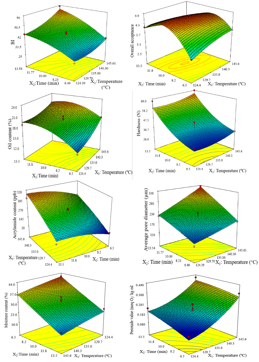 Vacuum frying conditions were investigated with respect to physical, chemical and sensorial properties of French fries and frying oil, besides determining the effect of frying conditions in terms of frying temperature and time. In order to determine the optimum frying conditions of the French fries optimization study was carried out according to Central Composite Rotatable Design. The results were evaluated to determine optimum vacuum frying conditions targeting minimum oil content, 30–45 N in range of hardness, minimum acrylamide content and maximum overall preference. The optimum vacuum frying condition was selected as 124.39 °C of frying temperature and 8.36 min of frying time for French fries. The French fries obtained at optimum conditions for vacuum frying preserved the desired color, textural properties and flavor and it has low oil content and reduced acrylamide formation. In addition, the frying oil quality was preserved with vacuum frying.