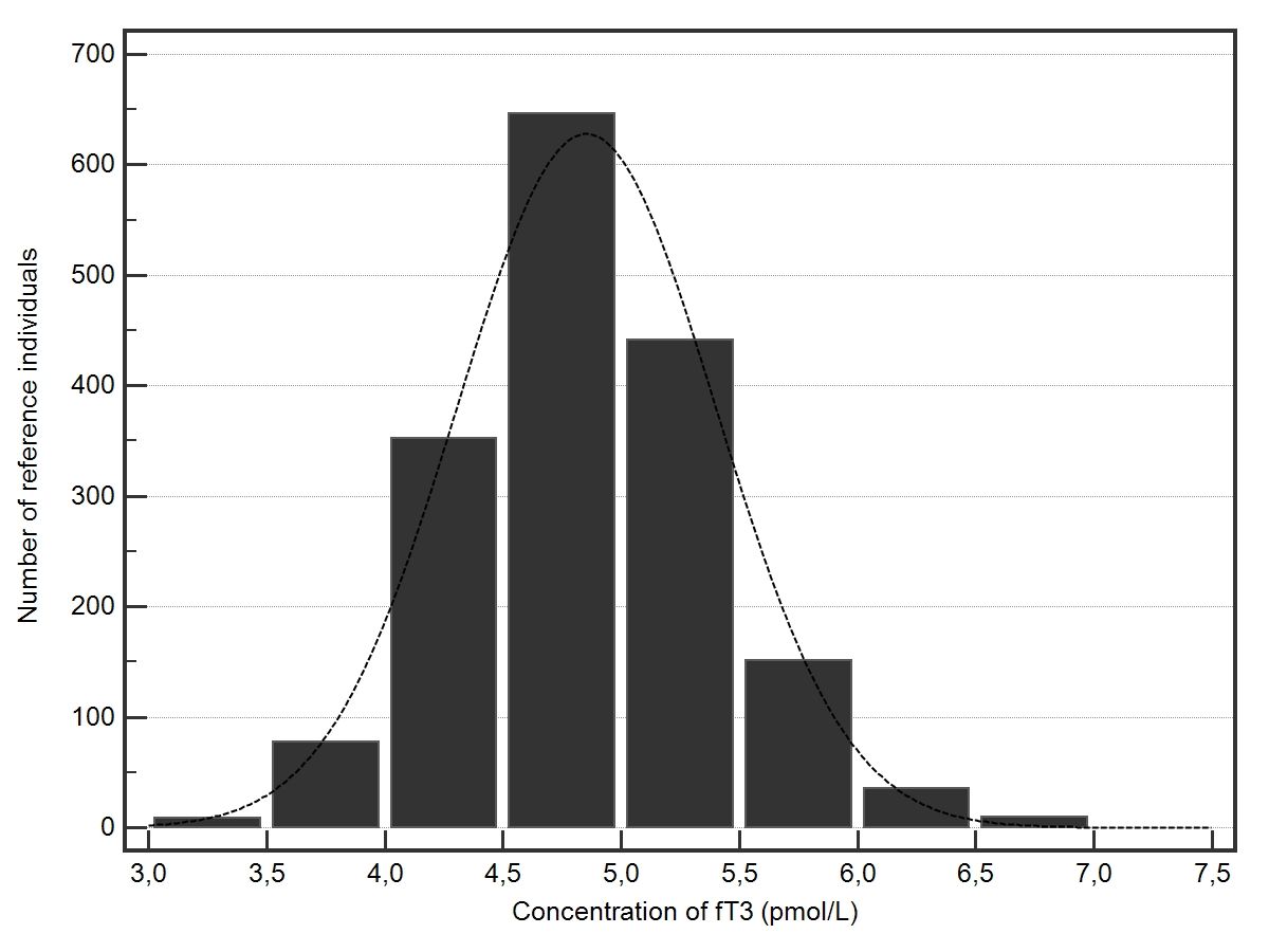 For thyroid function estimation and clinical decision making, use of appropriate reference intervals for thyroid-stimulating hormone (TSH), free thyroxine (fT4) and free triiodothyronine (fT3) is crucial. For each laboratory, establishment of own reference intervals is advised. For the first Slovenian estimation of reference intervals for thyroid hormones a large group of 1722 healthy individuals without thyroid disease was established retrospectively. Hormone analyses were performed on automated analyser Advia Centaur XP Immunoassay System (Siemens Healthineers), which reference intervals for TSH, fT4 and fT3 were 0.55-4.78 mIU/L, 11.5-22.7 pmol/L, and 3.5-6.5 pmol/L, respectively. Statistical analysis followed non-parametric percentile method. Our laboratory reference intervals for TSH, fT4 and fT3 are mostly narrower than intervals given by manufacturer. Median value, lower and upper limit for TSH, fT4 and fT3 were 1.98 (0.59-4.23) mIU/L, 14.5 (11.3-18.8) pmol/L and 4.82 (3.79-6.05) pmol/L, respectively. Most likely, an inclusion of a high number of healthy individuals without thyroid disease was a reason for such results.