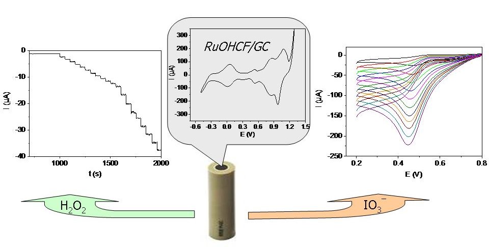 Ruthenium oxide hexacyanoferrate (RuOHCF) film was electrochemically deposited onto a glassy carbon (GC) surface using consecutive cyclic voltammetry as a facile and green synthetic strategy. The electrochemical behaviour and electrocatalytic properties of the modified electrode RuОHCF/GC were evaluated with regards to electroreduction of hydrogen peroxide and iodate in a strong acidic medium (pHs 1.0 – 2.0) by using different electrochemical techniques, including cyclic voltammetry and amperometry at a constant potential. Electrochemical studies indicated that RuОHCF/GC possess a high catalytic activity in both studied reactions, fast response and good reproducibility of the current signal. The RuОHCF/GC exhibits enhanced electrocatalytic behaviour compared with other modified electrodes reported before. The simple and reproducible procedure for electrode fabrication, the wide linear range, anti-interference performance and long-time stability of the RuОHCF/GC make it a promising sensing material for practical quantitative determination of hydrogen peroxide and iodate. Remarkably, the reported modified electrode provided superior sensitive (1050 µA mM–1 cm–2) and highly selective amperometric detection of iodate.