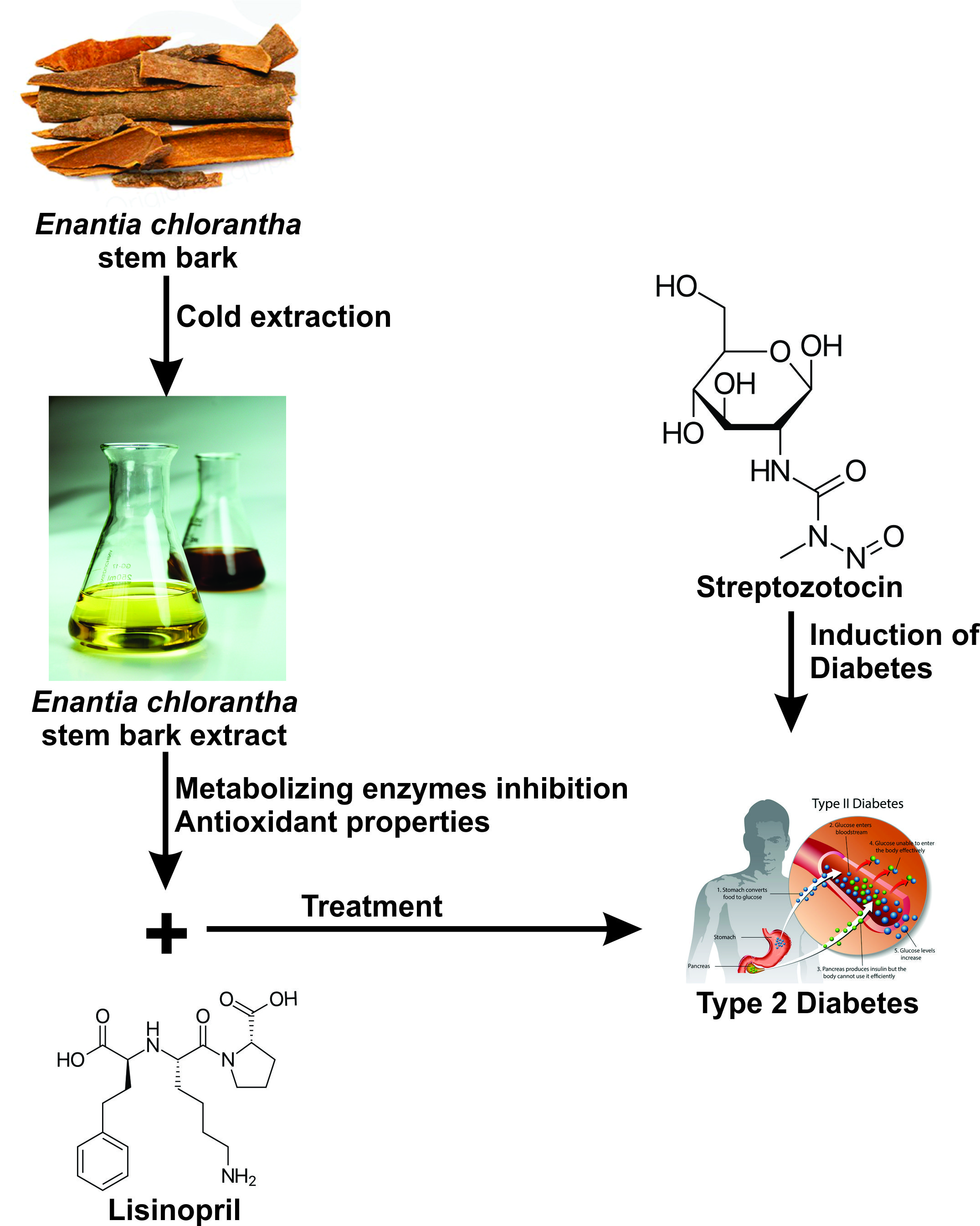 This study validates the antidiabetic efficacy of Enantia chlorantha stem bark and the possible therapeutic implications of the co-administration of lisinopril and E. chlorantha in type 2 diabetic rats. E. chlorantha stem bark was extracted by cold maceration. The inhibitory effect of the plant on carbohydrate metabolizing enzymes and its antioxidative potentials were assessed in vitro. The extract exhibited α-amylase and α-glucosidase inhibitory activities and also showed antioxidative properties in vitro. Administration of the extract normalized fasting hyperglycemia in vivo by showing 47.24 % reduction in blood glucose levels relative to untreated diabetic rats. Co-administration of E. chlorantha and lisinopril restored serum glucose and serum lipid profile levels. E. chlorantha stem bark displayed antidiabetic potentials as compared with a standard antidiabetic drug (metformin). The study also showed that the plant contained some bioactive compounds which we hypothesize might be responsible for the observed activities. Co-administration of the plant with lisinopril conferred no significant therapeutic advantage on the serum glucose level and lipid profile.