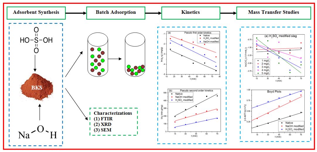 In the present study, brick kiln slag (BKS) has been utilized for low concentration As(III) adsorption in batch mode. BKS was modified with H2SO4 (SA) and NaOH (SB) for enhancing As(III) uptake capacity. Maximum adsorption capacity (13.7 mg/g) was observed for SA at 298 K, pH = 7.0, adsorbent dose = 0.3 g and time = 70 min which was 1.4 times higher than that of SB. Adsorption data modelled into Freundlich isotherm and pseudo-second-order kinetics. Mass transfer coefficients decreased with increase in As(III) concentration. Film diffusion significantly dominated the adsorption of As(III) ions irrespective of the initial concentration. Dimensionless Sherwood number (Sh) interrelated As(III) concentration (Co) as: Sh = 2.97(Co)–0.376, Sh = 4.12(Co)–0.215, Sh = 4.83(Co)–0.588 for H2SO4 modified, NaOH modified and native slag respectively. Low temperature (298 K) favoured As(III) adsorption (based on ∆G° value). Therefore, the modified slag can be used as an effective adsorbent for As(III) remediation from groundwater.