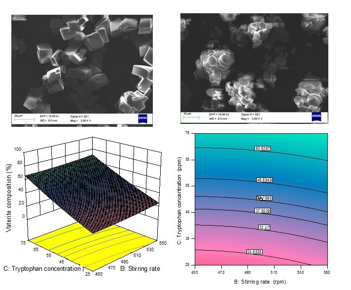 The objectives of this study were to: (i) determine the effects of tryptophan on the polymorphic phase transformation of CaCO3, (ii) investigate the thermal degradation characteristics of CaCO3 in terms of kinetics and thermodynamics using the Coats–Redfern method, and (iii) assess the influence of the experimental conditions on the vaterite composition of CaCO3 using response surface methodology based on central composite design. First, the CaCO3 crystals were prepared and analyzed using XRD, FTIR, SEM, BET, AFM, and zeta potential analysis. Based on the characterization results, the shape of the CaCO3 crystals changed from smooth cubic calcite crystals to porous irregular spherical-like vaterite crystals with increasing tryptophan concentration. Meanwhile, the kinetic results showed that the thermal degradation of CaCO3 followed the shrinkage geometrical spherical mechanism, R3 and the average activation energy was 224.6 kJ/mol. According to the results of the experimental design, the tryptophan concentration was the most influential variable affecting the relative fraction of vaterite in the produced crystals. It can be concluded that tryptophan is important for better understanding and controlling the polymorph, size, and morphology of CaCO3 crystals.