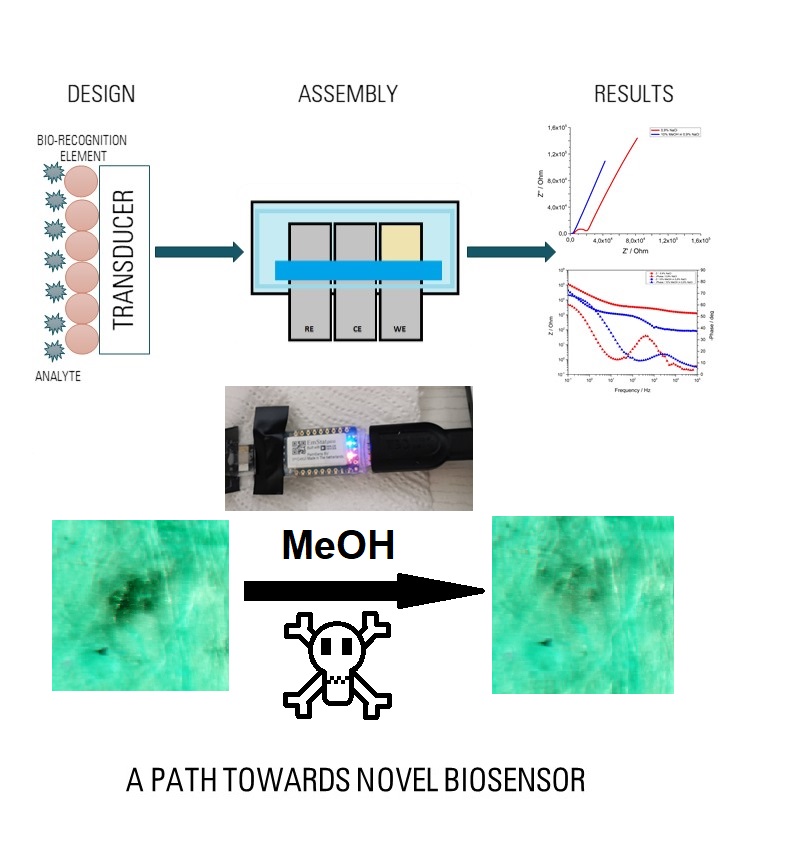 An electrochemical device that serves as a model biosensor and contains yeast Saccharomyces cerevisiae as the active biological element was developed. Different configurations of the electrochemical cells were assembled and tested. Stainless steel was used in the electrochemical cell composition process and the surface of this metal electrode was modified with a thin layer of WO3 if necessary. The yeast Saccharomyces cerevisiae was adhered to the working electrode. The resulting model biosensor was then used to monitor the response to a 10% CH3OH. For detection of biological activity, the electrochemical impedance spectroscopy (EIS) method was applied with a portable potentiostat/galvanostat, where the Bode and the Nyquist plots were interpreted. The stability of the device was beforehand determined by measuring the open circuit potential (OCP). The topography of the electrodes was inspected using the techniques of scanning electron microscopy and optical microscopy. The investigated model biosensor serves as a case study for the development of more complex biosensors that utilize living cells as the active layer.