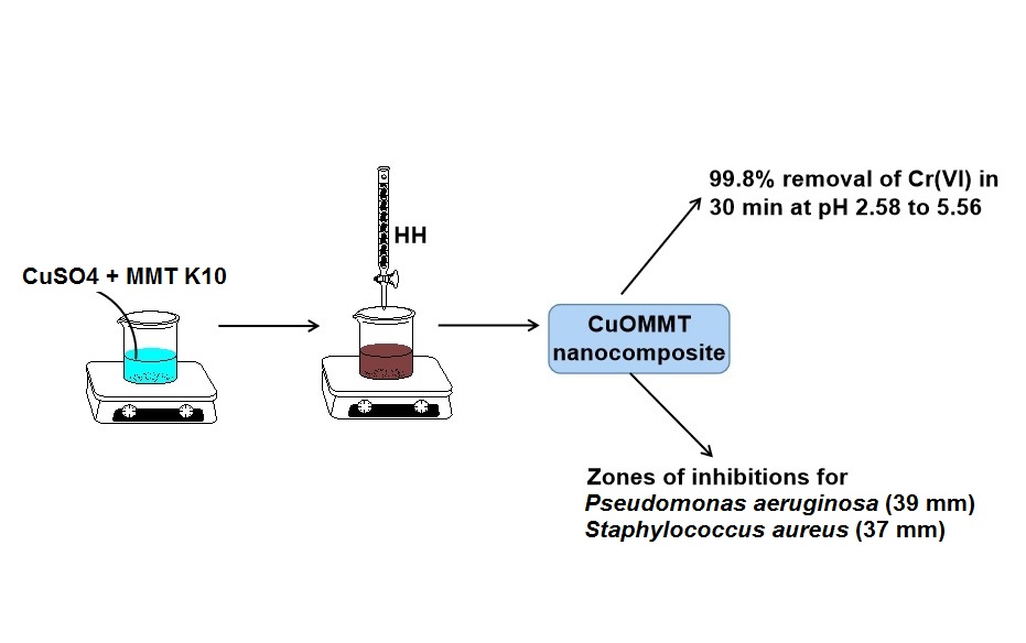 Montmorillonite K10 (MMT K10) supported copper oxide nanoparticles (CuONPs) were synthesized by incorporating CuONPs onto the surface of MMT K10 by reducing the metal precursor with the help of hydrazine hydrate. Effects of various factors on the efficiency of composite to remove hexavalent chromium were studied to find out the optimum conditions for maximum removal. Under optimum conditions 15 mg of the synthesized nanocomposite was found capable to almost completely remove (99.9 %) hexavalent chromium in 30 min from a 10 ppm aqueous chromium solution and that too in a wide range of pH from 2.88 to 5.56. The synthesized MMT K10 supported CuONPs were characterized by UV, SEM-EDX, FTIR and XRD studies. The average particle size of supported CuONPs was found to be 22.9 nm. Antibacterial potential of the prepared composite was also studied for one Gram-positive bacterium Staphylococcus aureus (ATCC 25323) and one Gram-negative bacterium Pseudomonas aeruginosa (ATCC 27853). The prepared nanocomposite was found to have excellent bactericidal potential and its statistical analysis was performed using t-test which indicates both bacterial strains of Pseudomonas aeruginosa and Staphylococcus aureus show different zone of inhibition for different concentrations.