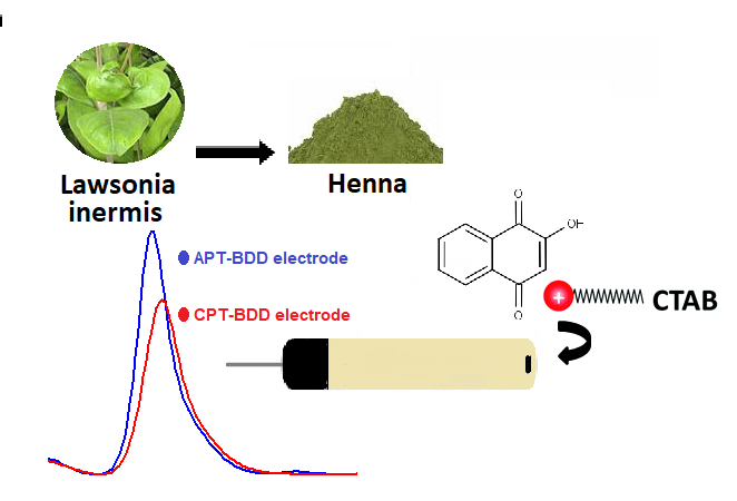 In this reported work, an anodically pretreated boron-doped diamond (BDD) electrode was used for the inexpensive, simple and quick detection of a natural dye, lawsone. Lawsone had a well-defined, irreversible and diffusion-controlled oxidation peak at approximately +0.19 V in phosphate buffer solution (PBS, 0.1 M, pH 2.5) using cyclic voltammetry (CV). The oxidation peak heights of lawsone were significantly increased in PBS using the cationic surfactant cetyltrimethylammonium bromide (CTAB). Under optimized experimental conditions, the calibration curve was linear over a concentration range of 0.1–5.0 μM with detection limit of 0.029 μM in 0.1 M PBS (pH 2.5) containing 0.1 mM CTAB by using square-wave voltammetry (SWV). To evaluate the practical applicability of the BDD electrode, it was used for the quantification of lawsone in commercial henna, a natural dye made from the leaves of the henna plant.