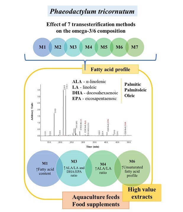 The effect of direct transesterification methods on the omega-3/6 composition of extracts from Phaeodactylum tricornutum was studied. The aim of this work was to identify an extraction method which allowed to obtain the most suitable profile of fatty acids in terms of its potential benefits to health, particularly if further used in the food industry. Seven methods using acids, alkalis, and heterogeneous-catalysts, (namely methods from 1 to 7, abbreviated as M1-M7) were performed to determine α-linolenic (ALA), linoleic (LA), docosahexaenoic (DHA) and eicosapentaenoic (EPA) acids. The composition of fatty acids was in all cases characterized by the major abundance of palmitic (23.95–34.08%), palmitoleic (30.94–35.56%), oleic acids (3.00–7.41%), and EPA (0.5–6.45%). Unsaturated fatty acids extraction yield was higher with a two-step transesterification process (M6, 63.65%). The total fatty acid methyl ester content (FAME) obtained with acid-transesterification (M1) reached about 21% wt, and 60% w/w total lipids. ALA higher relative content (ALA/LA ratio) was obtained when a lipid pre-extraction step was performed prior to acid-catalysis (M4). The transesterification method based on alkali-catalyst (M3, KOH catalyst) led to obtain higher DHA relative contents (DHA/EPA ratio up to 0.11), although its FAME content was 3.75-fold lower than that obtained with acid-transesterification (M1). Overall, this study shows that direct transesterification with alkali-catalyst (M3) improves the determination of PUFA content from the diatom through a more efficient transesterification-based extraction process, and thus allow to assess the value of the biomass more accurately for application in the food industry.