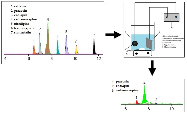 This study reports electrochemical treatment of different therapeutic classes of pharmaceuticals (caffeine, prazosin, enalapril, carbamazepine, nifedipine, levonorgestrel, and simvastatin) in a mixture. The electrochemical process was investigated using graphite-PVC anode at different applied voltages (3, 5, and 12 V), initial concentrations of studied pharmaceuticals in aqueous solution (5 and 10 mg/L), and concentrations of sodium chloride (1 and 2 g/L). The % removal of pharmaceuticals increased with the applied voltage, and was found higher than 98% after 50 min of electrolysis at 5 V. Energy consumption ranged between 0.760 and 3.300 Wh/mg using 12 V being the highest value compared to 3 and 5 V. The formation of chlorinated by-products from four selected pharmaceuticals, simvastatin (C11H13Cl3O5, and C10H12Cl4O3), prazosin (C13H12Cl3N5O3 and C10H11Cl4N2O2), carbamazepine and caffeine (C15H11N2O2Cl and C8H9N4O2Cl) was identified and elucidated using liquid chromatography-time of flight mass spectrometry (LC-TOF/MS).