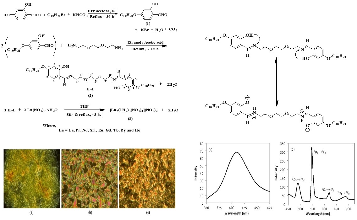 A mesogenic Schiff base, N,N’-di(4-decyloxysalicylidene)-1’,8’-diamino-3’,6’-dioxaoctane (H2L) and a series of homo dinuclear lanthanide(III) complexes of the type [Ln2(LH2)3(NO3)4](NO3)2, (Ln = La, Pr, Nd, Sm, Eu, Gd, Tb, Dy, and Ho) were synthesized and characterized by elemental analysis, mass spectrometry, FTIR, and NMR spectral techniques. The IR and NMR spectral evidences imply bonding of a neutral bidentate H2L species through two phenolate oxygen atoms in its zwitterionic form to LnIII, rendering the overall geometry of the complexes as a seven-coordinate polyhedron – possibly distorted mono-capped octahedron. Differential scanning calorimetry (DSC) and polarizing optical microscopic (POM) studies reveal mesogenic properties (smectic-X, smectic-A and nematic mesophases) in the ligand over a wide range of temperature but none mesomorphism in the LnIII complexes synthesized under this study. Luminescence studies exhibit emissions of H2L and TbIII complex.