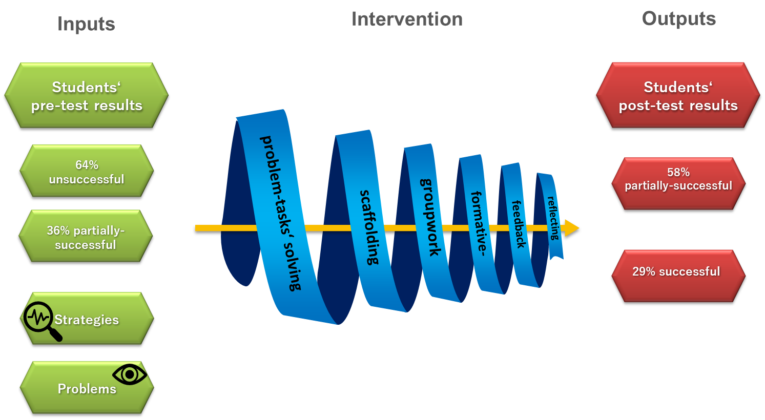Studies on students’ problem-solving skills worldwide suggest there is a room for improvement. This study aimed at improving upper-secondary school students’ problem-solving skills in chemistry lessons. They were given a problem tasks pre-test focused on their conceptual knowledge regarding the periodic table, ability to apply knowledge on the factors affecting chemistry reaction rate and compounds’ properties. Most students (72 out of 112) did not succeed to solve the tasks. For this reason, an intervention was designed based on a study using eye-tracking combined with think-aloud. It consisted of students’ working on (PISA-like) context-based chemistry problem tasks with a special scaffolding. A teacher provided formative assessment promoting students’ expansive strategies. The intervention’s effect was again assessed using problem tasks in two post-tests. The results showed the action plan was successful in helping the majority of students reach above-average test score. The ratio of successful solvers also rose and unsuccessful significantly declined.