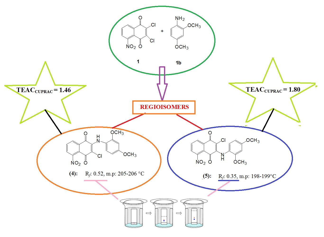 The synthesized NQ regioisomers were evaluated for catalase enzyme inhibitory activities and antioxidant efficiency. The synthesized regioisomers were screened for their antioxidant capacity using the cupric-reducing antioxidant capacity (CUPRAC) method. 2-Chloro-3-((2,4-dimethoxyphenyl)amino)-5-nitronaphthalene-1,4-dione (5) showed the highest antioxidant capacity with a 1.80±0.06 CUPRAC-trolox equivalent antioxidant capacity (TEAC) coefficient. Compound 5 also showed strongest catalase enzyme inhibitory activity. The antioxidant capacity results of all 2-chloro regioisomers are higher than the 3-chloro regioisomers. Likewise, also catalase enzyme inhibitory activities results were determined in the same way, except for one regioisomer pair. The catalase was effectively inhibited by the newly synthesized compounds, with % inhibition values in the range of 0.71–0.86%. Some of these NQ compounds also showed remarkable antioxidant capacities.
