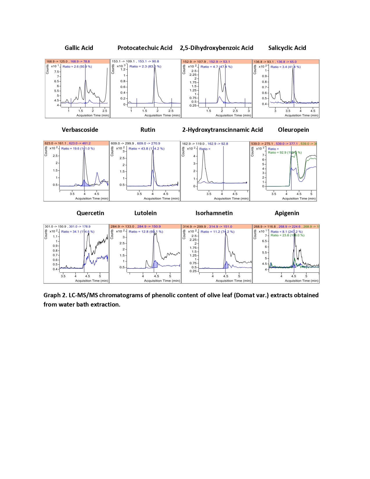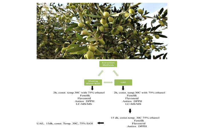 Objective: To obtain high antioxidant results and to determine the phenolic compounds contained in olive leaf (Domat var.) by LC-MS/MS after ultrasonic water bath and shaking water bath extraction comparison in a shorter time instead of 2 h.