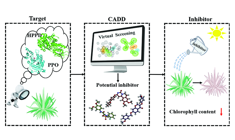 The development and identification of dual target herbicides was one of primary approach to addressing the issue of weed resistance. Protoporphyrinogen oxidase (PPO) and p-hydroxyphenylpyruvate dioxygenase (HPPD) are two important targets of photosynthesis in plants. Different from the traditional single target drug design, this study focuses on HPPD and PPO dual target drug design. Hiphop pharmacophore models of HPPD and PPO targets were constructed use commercial pesticides, and CBP pharmacophore models were constructed based on protein complexes. Over millions of molecules were screened using pharmacophore models and 8 compounds were obtained. Candidate compounds chelated with Fe (II) in HPPD and formed stable π-π interactions with key residues in HPPD active pocket. Most compounds produced hydrogen bond interactions and π-π interactions with residues in PPO. Combined with a multiple visual screen process, potential compounds with dual-target inhibition effect were obtained.