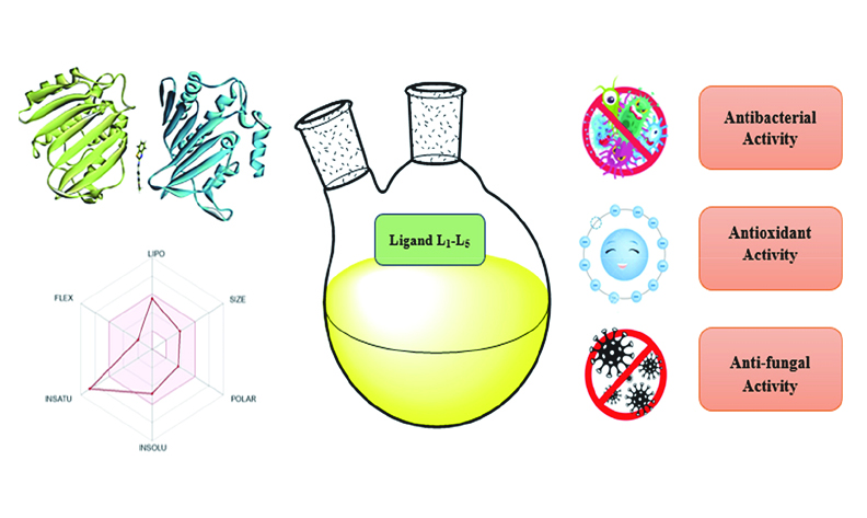 In this study, a series of new condensation products L1–L5 have been synthesized from substituted pyridinecarbaldehydes and 2-aminobenzothiazole and characterized by FTIR, UV-Visible, 1H NMR spectroscopy and ESI-MS analysis. Additionally, compound L1 was structurally characterized through single-crystal X-ray diffraction study exhibiting four crystallographically independent molecules in the asymmetric unit. All the synthesized compounds exhibited antibacterial activity against Gram-negative and Gram-positive bacteria as well as against Candida albicans ATCC 60193 and Candida tropicalis ATCC 13803. All the compounds were optimized by using DFT-D method. Total energy values for compounds were calculated then, the reactivity descriptors were theoretically proven by computing the HOMO and LUMO energies. The prediction of ADME properties indicated that all of the compounds exhibit good drug-likeness and pharmacokinetic properties.