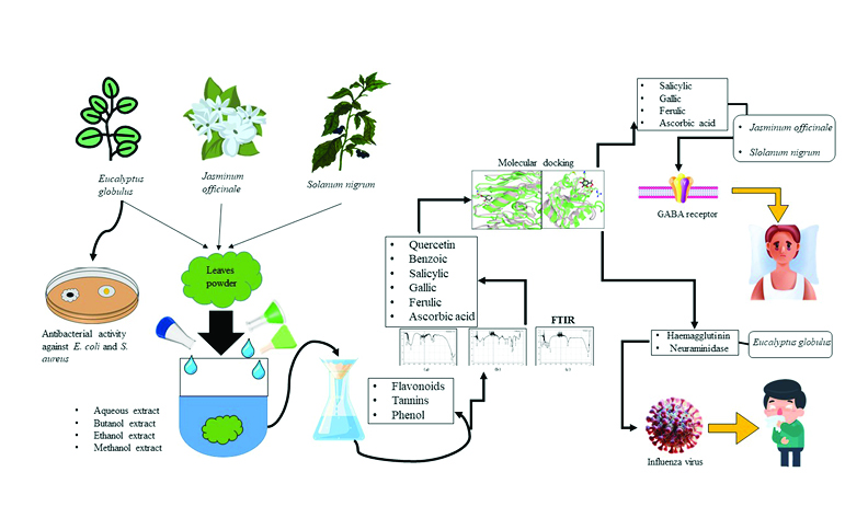 In this study, the plants Eucalyptus globulus (E. globulus), Jasminum officinale (J. officinale), and Solanum nigrum (S. nigrum) are investigated for their antibacterial, antioxidant, and therapeutic properties. The extraction solvents (aqueous, methanol, ethanol, and butanol) were used for phytochemical screening, antibacterial activity while aqueous extracts were specifically used for antioxidant analysis. The quantitative determination showed that the highest phenolic and tannin content was found in J. officinale, while highest flavonoid and alkaloids levels were found in E. globulus among the tested species. The disc diffusion method was followed for assessing the antibacterial activity against Escherichia coli (E. coli) and Staphylococcus aureus (S. aureus). All extracts of E. globulus leaves showed antibacterial activity against E. coli and S. aureus. The aqueous extracts on FTIR showed quercetin, benzoic, salicylic, gallic, ferulic, and ascorbic acid. Furthermore, in silico analysis to assess the interaction of selected bioactive compounds, quercetin and benzoic acid, found in E. globulus, were docked with haemagglutinin and neuraminidase, as these influenza virus surface proteins play an important role in the virus's ability to infect host cells. Salicylic, gallic, ferulic, and ascorbic acid from J. officinale and S. nigrum, were docked with GABA receptor-associated proteins, which are important in synaptic transmission and plasticity.