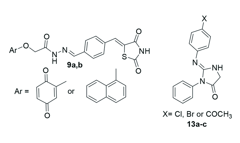 Novel families of thiazolidine-2,4-dione and imidazolidine-2,4-dione derivatives were synthesized. Thiazolidine-2,4-dione 3 was prepared using chloroacetic acid and thiourea, followed by condensation with terephthalaldehyde to form 4-((2,4-dioxothiazolidine-5-ylidene)methyl)benzaldehyde 4. This compound reacted with 2-aryloxyacetohydrazides 8a-b to yield Schiff bases 9a-b. Imidazolidine-2,4-diones 13a-c were synthesized via cyclizing of anilines 10a-c, urea 11, and chloroacetic acid 12. The compounds 9a-b and 13a-c were evaluated for antitumor activity against the Caco-2 cell line, compounds 13b and 13c exhibiting the highest potency (IC50 values of 41.30 ± 0.07 μM and 109.2 ± 0.027 μM, respectively). DFT calculations, including HOMO-LUMO analysis, energy gap estimation, and molecular docking, were conducted to evaluate and optimize the molecular properties of the target compounds.