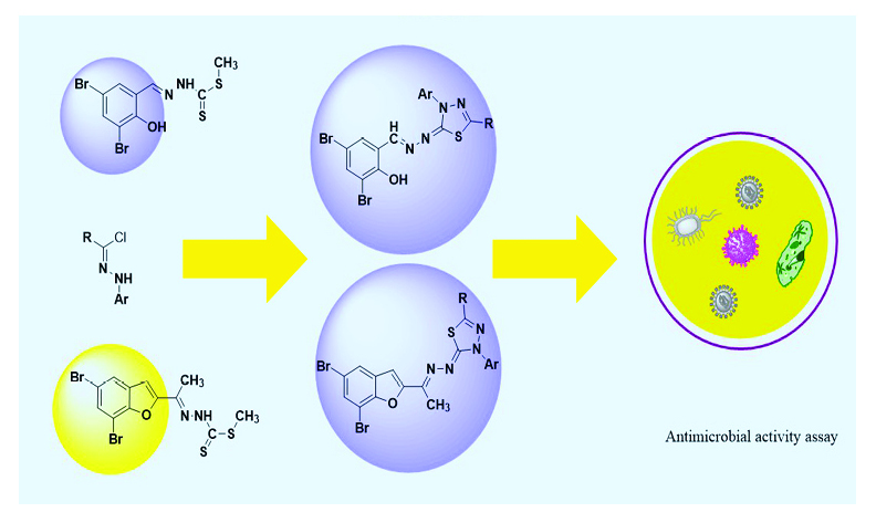 Two series of new 1,3,4-thiadiazole derivatives were synthesized through heterocyclization of methyl 2-(3,5-dibromo-2-hydroxybenzylidene)hydrazine-1-carbodithioate (4) and methyl (E)-2-(1-(5,7-dibromobenzofuran-2-yl)ethylidene)hydrazine-1-carbodithioate (5) with various hydrazonoyl chlorides, respectively. The structures of the newly synthesized products were elucidated through elemental analysis and spectral data. Eight new compounds from the first series (i.e. containing dibromohydroxybenzene moiety) were evaluated for their antimicrobial activity against Staphylococcus aureus ATCC 6538-P as the Gram-positive bacteria, Escherichia coli ATCC 25933 as the Gram-negative bacteria, Candida albicans ATCC 10231 as a yeast, and the filamentous fungus Aspergillus niger NRRL-A326 in comparison with neomycin as a reference drug in the case of S. aureus, E. coli and C. albicans whereas cyclohexamide was used as a reference for filamentous fungi. The results showed that some of the novel compounds have promising antimicrobial activity.